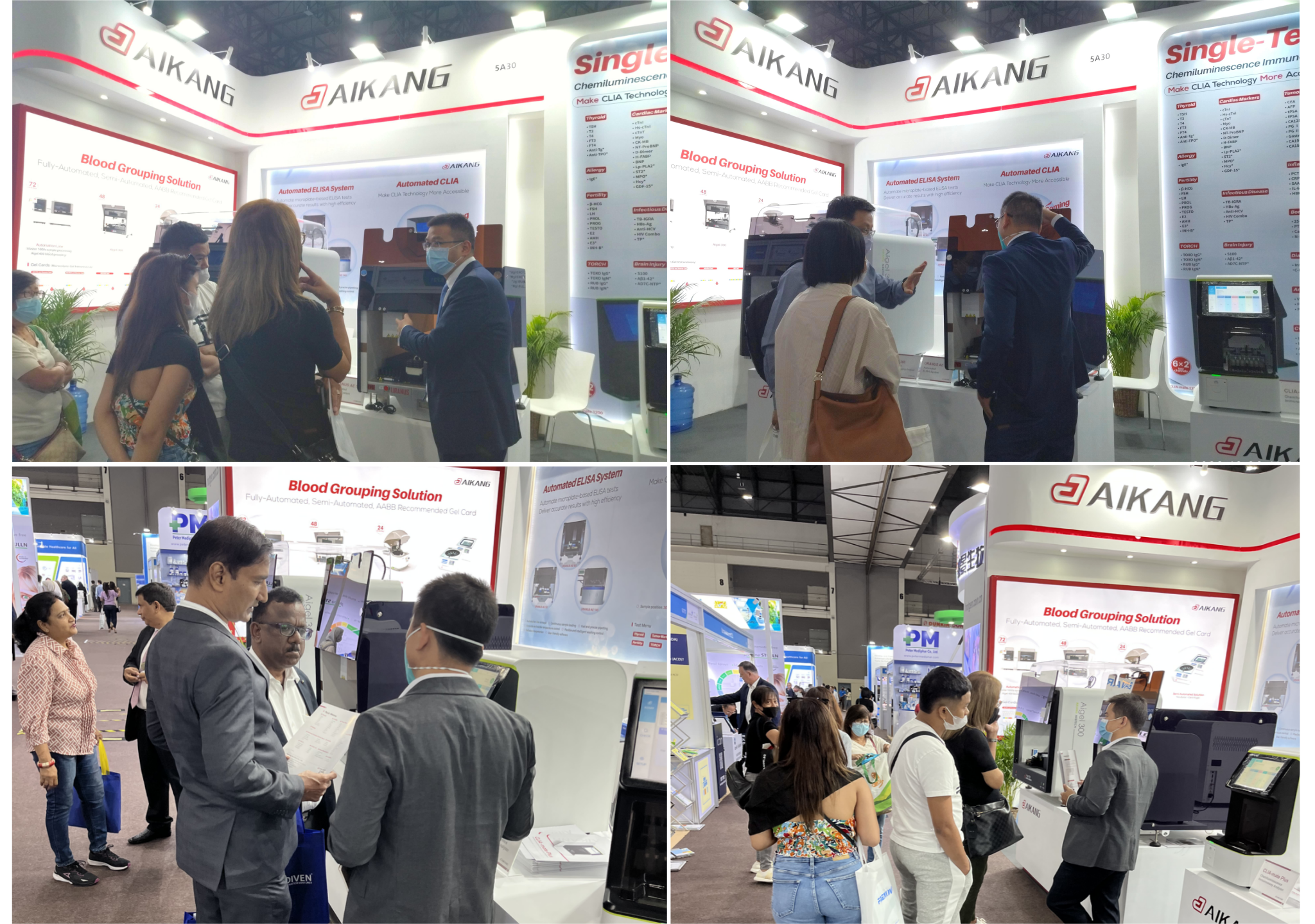 This time, Aikang showcased the Chemiluminescence Immunoassay solution (CLIA-mate Plus, C 900, CLIA-mate 1200), Automatic ELISA solution (URANUS AE55) and Automatic Blood Grouping solution (Aigel 300), which received much attention from a lot of new and old friends.