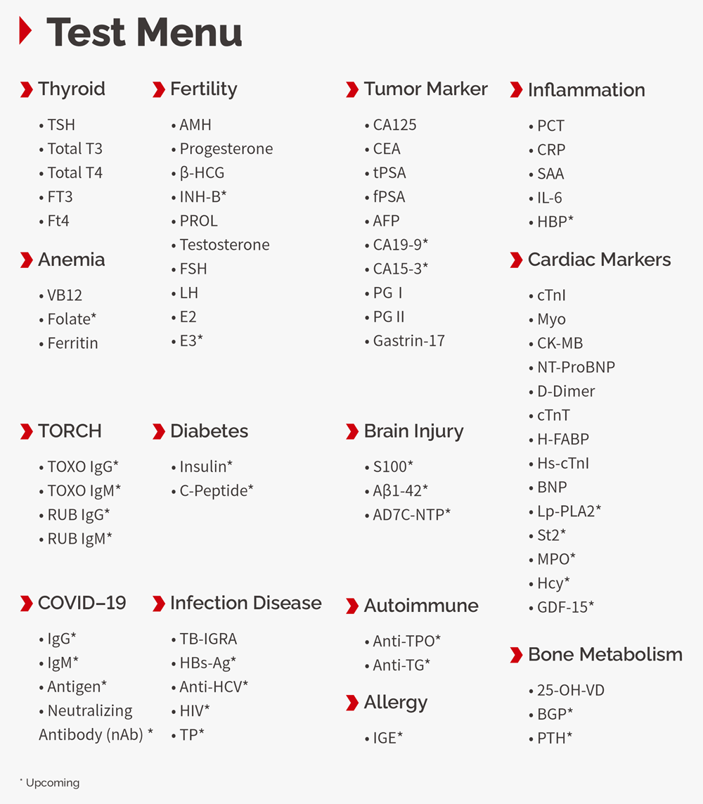 Test items conclude Cardiac Markers, Inflammation, Fertility, etc., and the follow-up items are continuously updated to meet more clinical needs.
