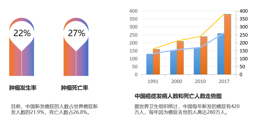 2020年中國(guó)新發(fā)癌癥病例457萬例,癌癥死亡病例300萬例。新發(fā)癌癥人數(shù)、癌癥死亡人數(shù)均位居全球第一?!督】抵袊?guó)2030規(guī)劃綱要》中提出總體癌癥5年生存率提高15%的目標(biāo)。